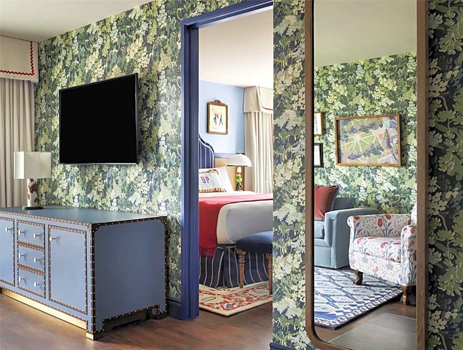 A separate living area with a sofa bed and flat-screen TV is featured in this room.